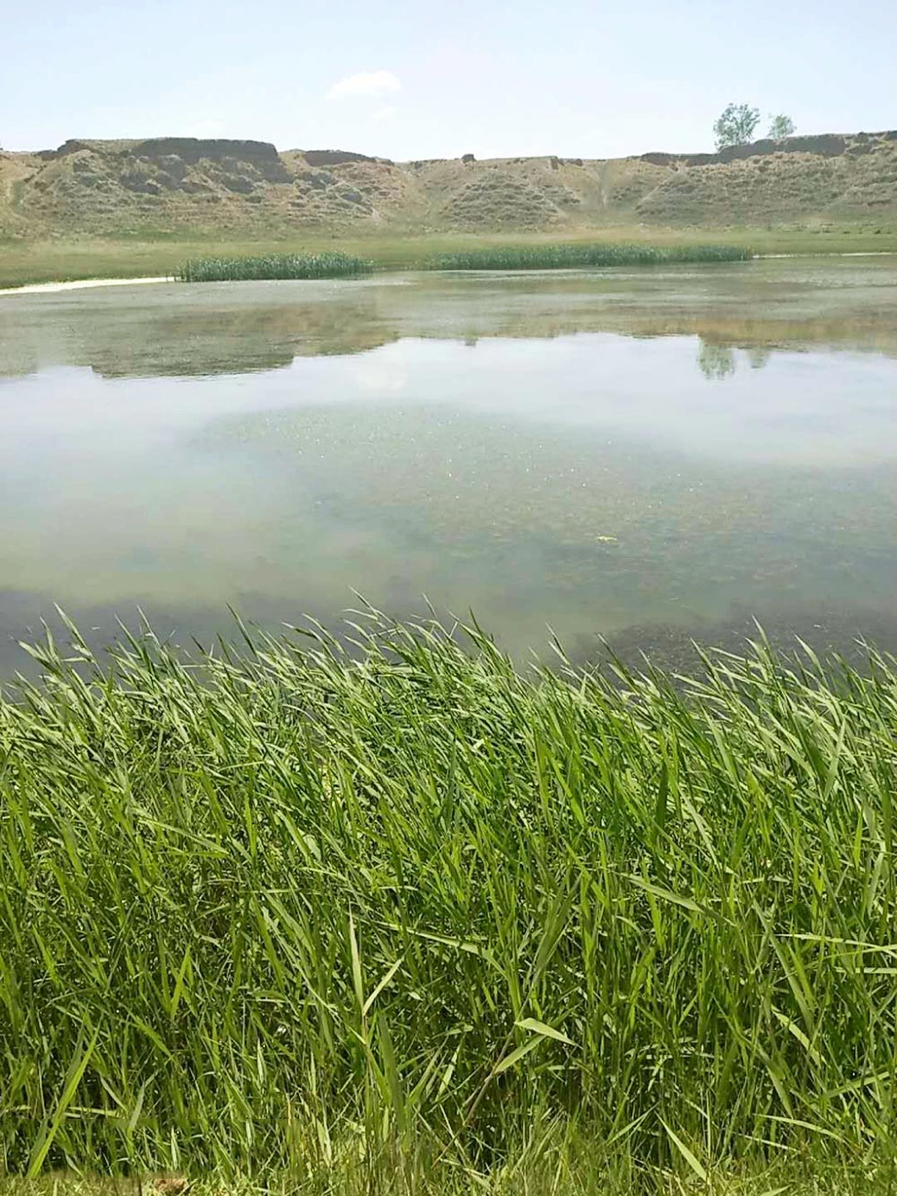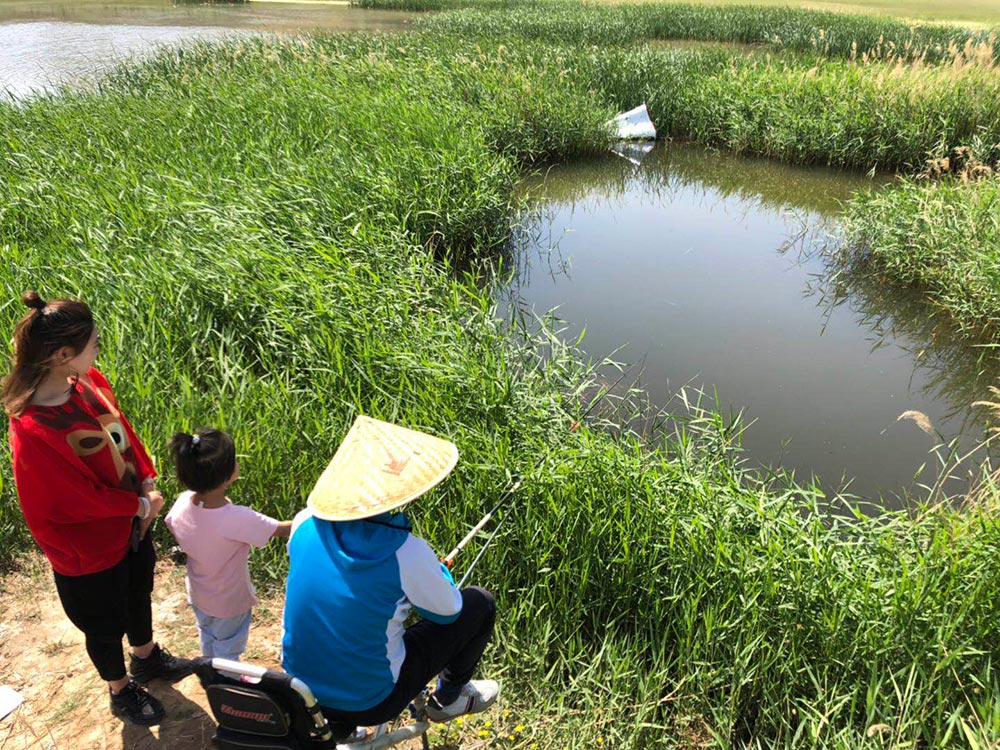 到達目的地后,看到藍天白云下的小土山和小池塘別有一番風味。碧綠的草地,清澈的魚塘,我們仿佛走進了一幅自然畫卷,暢游在美景中不愿走出。