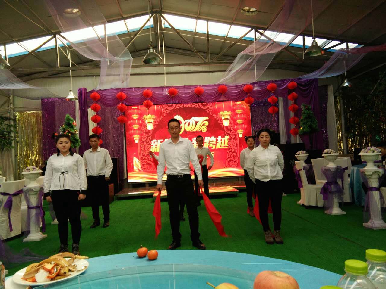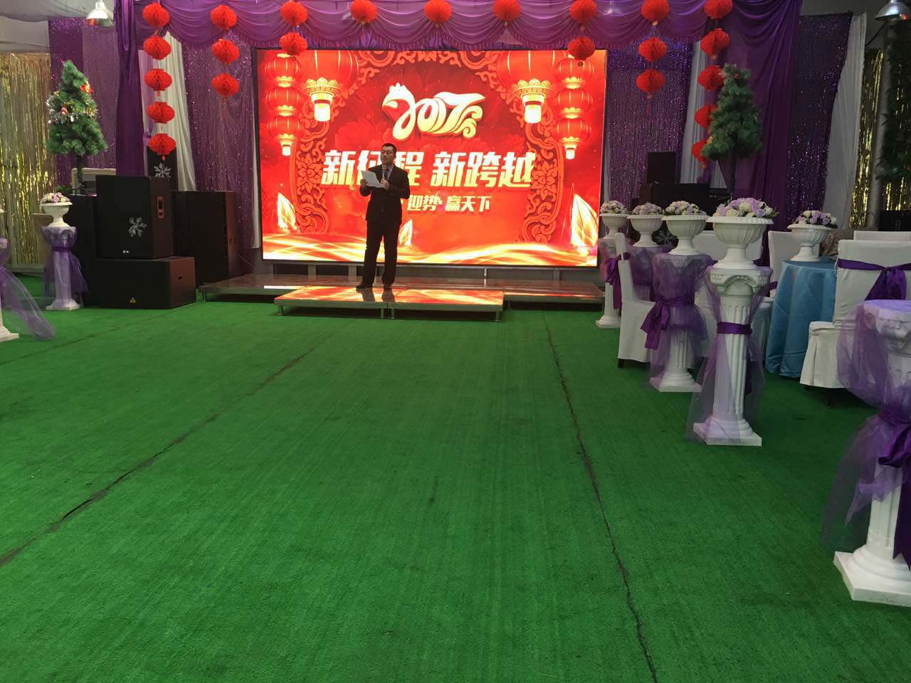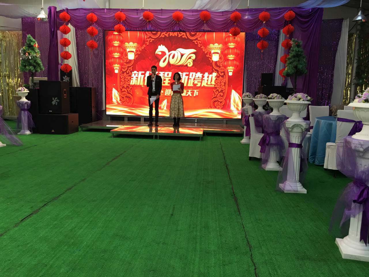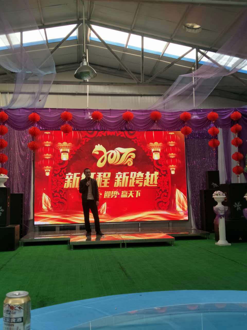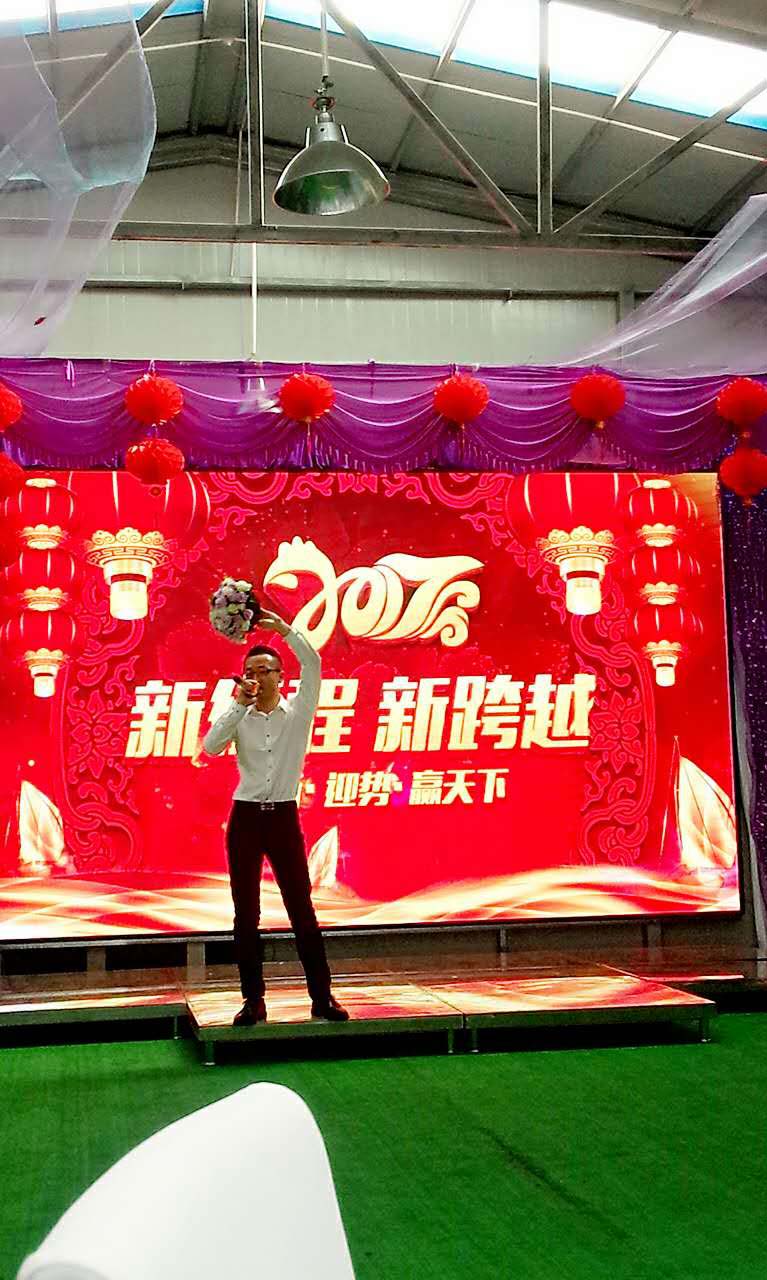 我們一行小伙伴相約來到鴻盛工業園區,伴隨著倒計時在屏幕上的閃現,在11點半的時候終于迎來了公司年會的正式開始,兩位主持人衣著盛裝走上了華麗的舞臺,致開場賀詞,并由公司苗總做新年致辭。